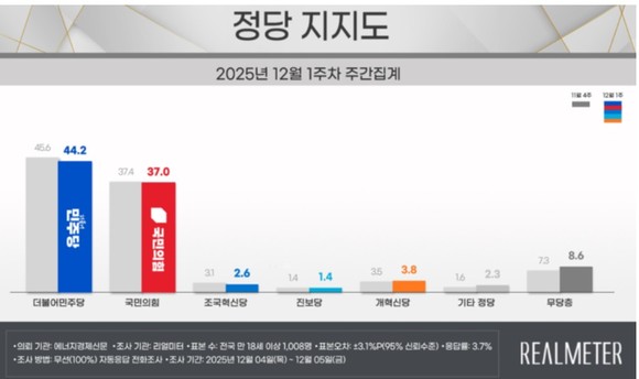 그리고 별도로 실시된 정당 지지도 조사에서는 더불어민주당이 전주 대비 1.4%p 하락한 44.2%, 국민의힘은 0.4%p 하락한 37.0%를 기록해 양당 격차는 전주 8.2%p에서 7.2%p로 축소됐으며, 이어 개혁신당은 3.8%(0.3%p↑), 조국혁신당 2.6%(0.5%p↓), 진보당 1.4%(변동 없음), 기타 정당 2.3%(0.7%p↑), 지지정당이 없는 무당층은 8.6%로 1.3%p 증가한 것으로 나타났다.