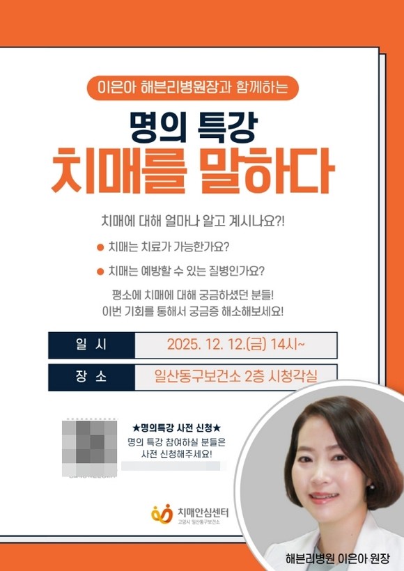 특강은 오는 12일 오후 2시 보건소 2층 시청각실에서 열린다. 참가를 원하는 시민은 사전 접수를 통해 신청할 수 있으며 당일 현장에서도 등록이 가능하다. 일정과 신청 방법은 일산동구보건소 치매안심센터 누리집에서 확인할 수 있다.