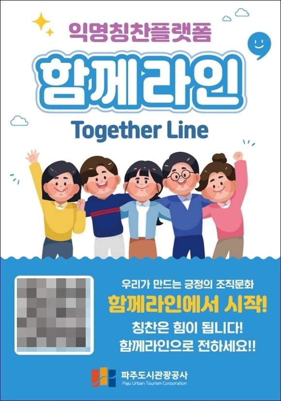 파주도시관광공사는 이달 초부터 직원과 고객이 함께 참여하는 스마트 익명 칭찬 플랫폼 ‘함께라인(Together Line)’ 운영을 시작했다고 밝혔다. 공사는 기존 익명제보 시스템이 문제 제보에 치우쳤던 한계를 보완하고, 칭찬과 격려 중심의 조직문화 확산 기반을 마련한다는 계획이다.