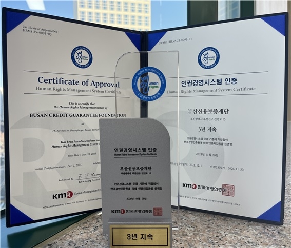 부산신용보증재단은 지난 1일 한국경영인증원(KMR)으로부터 ‘3년 연속 인권경영시스템 인증’을 획득했다고 밝혔다. 이는 재단이 인권을 최우선 가치로 삼아 지속적으로 인권경영을 실천해 온 노력이 대외적으로 다시 한번 인정된 성과이다.