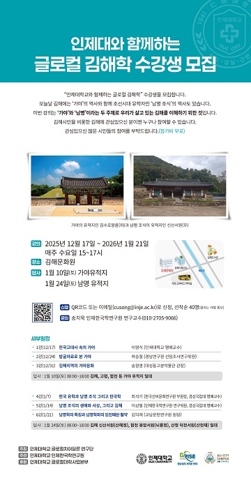 인제대학교 인제한국학연구원은 글로컬대학사업본부의 지원으로 지역학 기반 인문교양 프로그램인 ‘글로컬 김해학 강좌’를 개설하고 수강생을 모집한다고 10일 밝혔다. 강좌는 오는 17일부터 총 8회 일정으로 진행되며, 강의 6회, 현장 답사 2회로 구성된다.
