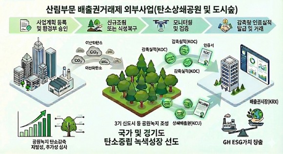 경기주택도시공사는 광명시흥 도시첨단산업단지 내 공원녹지를 활용한 ‘산림부문 배출권거래제 외부사업’의 정부 공식 승인 및 등록을 완료했다고 10일 밝혔다. GH가 추진한 배출권거래제 외부사업으로는 최초 사례다.