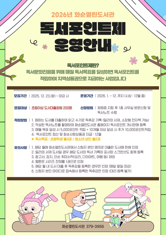 화순군(군수 구복규)은 10일 열린도서관에서 12월 23일(화)부터 ‘화순열린도서관 독서포인트제’ 참가자를 모집한다고 밝혔다.