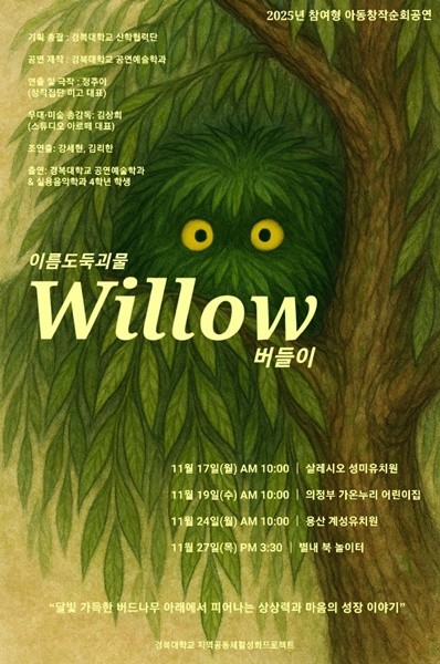 경복대학교 공연예술학과 전공심화과정 학생들이 제작한 참여형 창작아동극 'Willow-버들이'가 서울 성미유치원, 용산 계성유치원, 의정부 가온누리 어린이집, 남양주 별내 북놀이터까지 총 네 곳을 순회하며 성황리에 막을 내렸다.
