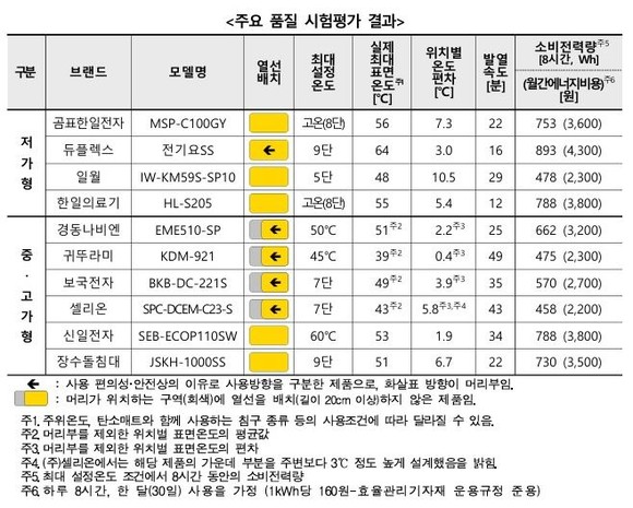 시험평가 결과, 제품에 따라 최대 표면온도·온도편차·발열속도 등에 차이가 있었다. 또한, 10개 중 4개 제품은 머리 위치(상단)가 구분되어 있으며 해당 영역(길이 20cm 이상)에는 열선이 없는 구조였다.