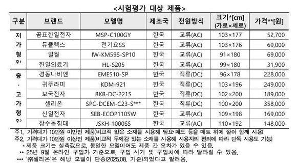11일 한국소비자원이 발표한 ‘탄소전기매트 품질비교 결과’에 따르면, 시중 제품별로 최대 표면온도, 온도편차, 발열속도 등 핵심 성능의 차이가 뚜렷해 가격과 품질, 제품 특성을 고려한 구매가 중요한 것으로 나타났다.