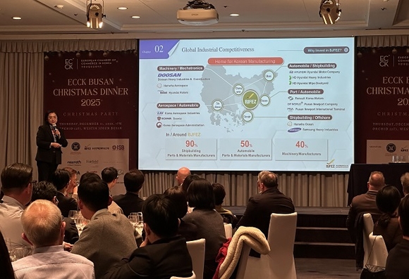 부산진해경제자유구역청이 지난 11일 부산 웨스틴 조선에서 열린 ‘ECCK Busan Christmas Dinner 2025’에 참석해 주한유럽상공회의소(ECCK, European Chamber of Commerce in Korea) 회원사와 유관기관을 대상으로 투자유치 활동을 펼쳤다.