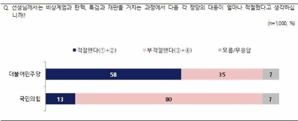 이어 ‘비상계엄과 대통령 탄핵 이후 각 정당의 대응’에 대한 질문에는 ‘적절했다’(‘매우 적절했다’+‘대체로 적절했다’)는 답변은 더불어민주당이 58%, 국민의힘은 13%로, 반면, ‘부적절했다’(‘대체로 부적절했다’+‘매우 부적절했다’)는 민주당 35%, 국민의힘 80%로 나타났다.