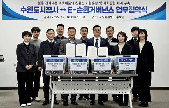 16일 오전 수원도시공사 수원시자원순환센터에서 열린 ‘공사·E-순환거버넌스 친환경 자원순환 및 사회 공헌 체계 구축을 위한 협약식’을 개최했다.