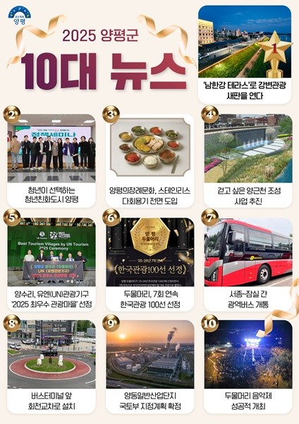 양평군은 ‘2025년 양평군 올해의 10대 뉴스’ 1위로 '양평군, "남한강테라스’로 강변 관광 새판을 연다”가 선정됐다고 16일 밝혔다.