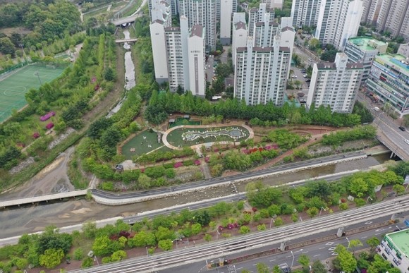 송산수변정원 조성사업은 곤제근린공원부터 민락2지구 수변공원까지 녹지축을 연결하는 구상으로, 무장애 경사로와 잔디광장, 산책로 등을 조성해 공원·녹지·하천 공간의 단절을 줄이는 방향을 제시했다.