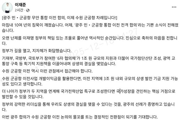 이어 “정부의 강력한 리더십으로 수원 군공항 이전도 상생의 열매를 맺을 수 있다는 것을, 광주의 선례가 증명하고 있다”고 밝혔다.