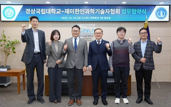 협약식에는 경상국립대 권진회 총장을 비롯해 본부 보직자와 글로컬대학사업단 관계자, 재미한인과학기술자협회 류재현 회장(아이다호대 교수)이 참석했으며, 양 기관은 실질적이고 지속 가능한 협력 기반을 마련하는 데 뜻을 모았다.