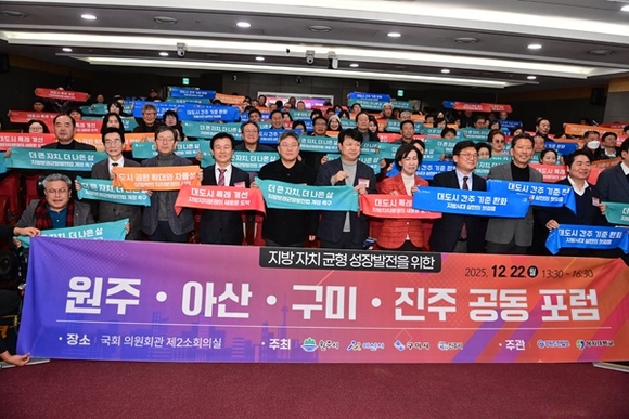 특히 이날 포럼에서는 진주·원주·아산·구미시장이 공동선언문에 서명하고, 인구 30만 명·면적 500㎢ 이상의 지방자치단체에 대도시 특례를 부여할 수 있도록 ▲「지방자치분권 및 지역균형발전에 관한 특별법」 일부개정안의 조속한 통과 ▲지방 거점도시의 자율적 성장 여건을 뒷받침할 제도적 기반 마련 ▲실질적인 권한 이양과 미래 성장 동력 지원을 정부와 국회에 공동으로 건의했다.