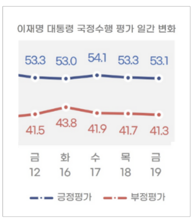 또한 대통령 부정 평가는 41.5%(12일) → 43.8%(16일) → 41.9%(17일) → 41.7%(18일) → 41.3%(19일)로 변했어요. 16일에 솟았다가 제 자리로 돌아온 결과입니다.