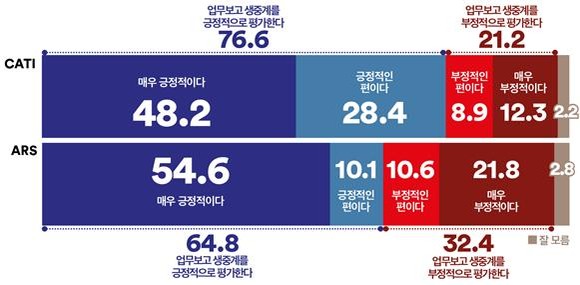 직접 전화를 걸어 응답을 받는 CATI(전화 면접) 조사에서는 응답자의 무려 76.6%가 ‘긍정적’이라고 답했습니다. ‘부정적’이란 반응은 21.2%에 그쳐 열 중 거의 여덟이 좋게 봤습니다.