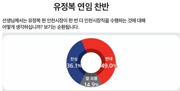 그리고 유 시장의 인천시장직 연임과 관련해서도 시민 49.0%가 ‘연임에 반대한다’며 부정적으로 답변한 반면, ‘찬성한다’는 긍정적인 답변은 36.1%로 ‘반대’ 답변이 20%p 이상 우세했으며, 특히 중도층에서도 ‘찬성’ 31.7% vs ‘반대’ 47.7%로, ‘반대’ 답변이 높게 나타났다.