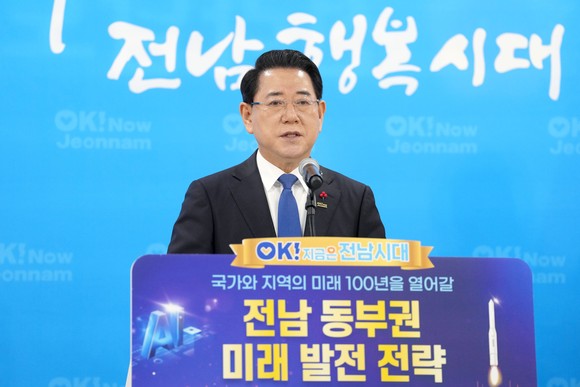 김영록 전라남지사는 24일 동부지역본부에서 열린 동부권 송년 기자 브리핑에서 2026년을 ‘동부권 100년 대도약의 원년’으로 선포하고 전남 미래 성장의 핵심 거점으로 육성하는 동부권 발전 전략을 발표했다.