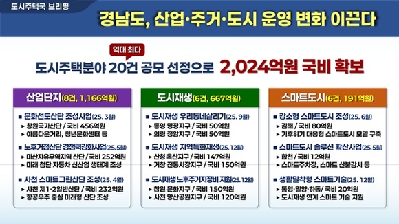경남도는 올해 도시주택분야 전반에 걸쳐 정부 공모사업에 전략적으로 대응한 결과, 역대 가장 많은 총 20건의 공모에 선정되며 국비 2024억 원을 포함한 총사업비 3163억 원을 확보했다고 24일 밝혔다.