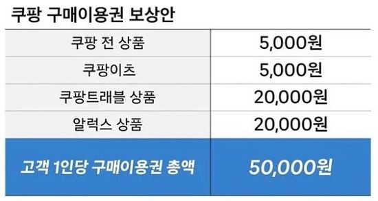 보상안은 1인당 5만원 규모로, 쿠팡 전체 상품과 쿠팡이츠·트래블·알럭스 구매 이용권 형태로 지급된다. 지난 11월 말 개인정보 유출 통지를 받은 3370만 계정의 이용자가 대상이다.