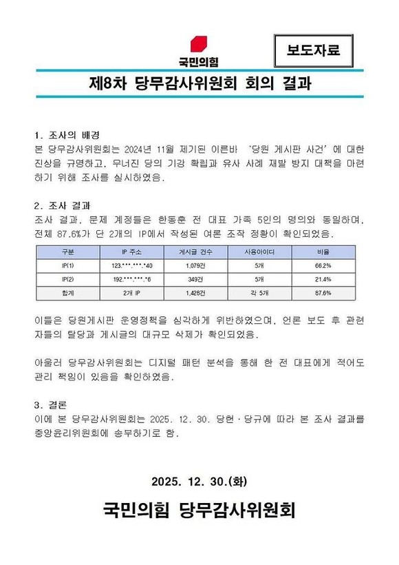 당무감사위는 이날 보도자료를 내고 ‘당게’ 사태와 관련해 “문제 계정들은 한 전 대표 가족 5인의 명의와 동일하며, 전체 87.6%가 단 2개의 인터넷 프로토콜(IP)에서 작성된 여론 조작 정황이 확인됐다”면서 “디지털 패턴 분석을 통해 한 전 대표에게 적어도 관리 책임이 있음을 확인했다”고 밝혔다.