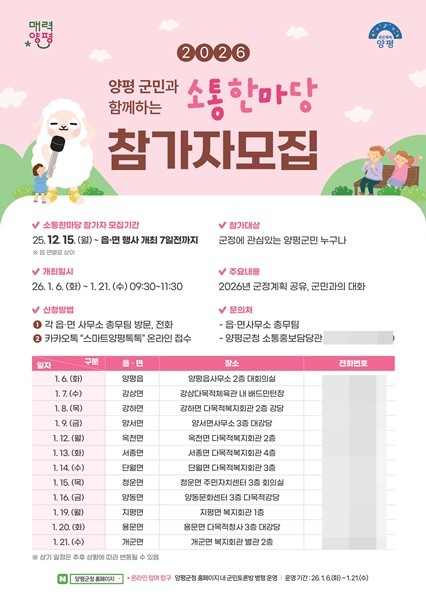 한편, ‘2026년 군민과 함께하는 소통한마당’은 오는 6일 양평읍, 7일 강상면, 8일 강하면, 9일 양서면, 12일 옥천면, 13일 서종면, 14일 단월면, 15일 청운면, 16일 양동면, 19일 지평면, 20일 용문면, 21일 개군면 순으로 개최된다.