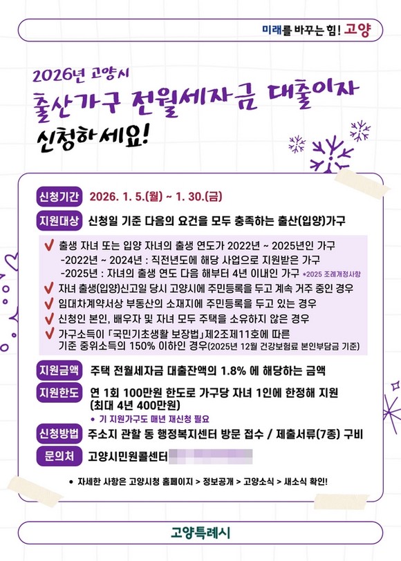 고양시는 ‘2026년 출산가구 전월세자금 대출이자 지원 사업’ 신청을 오는 30일까지 받는다고 밝혔다. 접수는 신청인 주소지 관할 동 행정복지센터에 방문해 하면 된다.