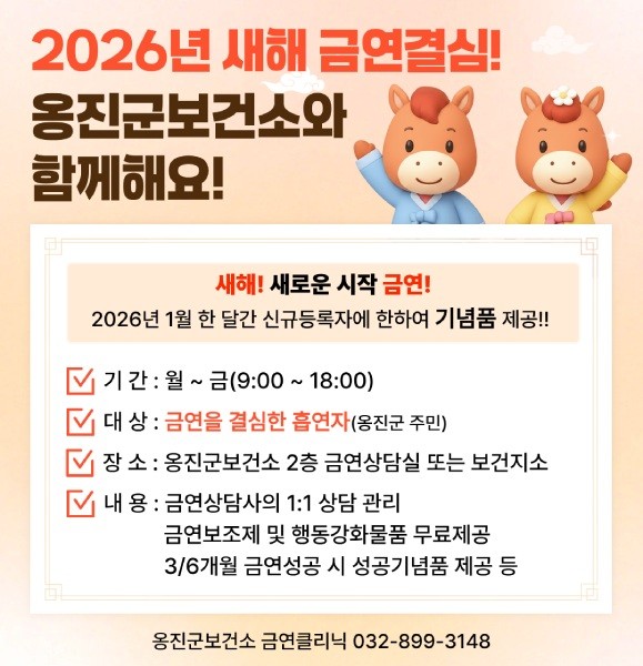 옹진군은 2026년 새해를 맞아 군민의 건강증진과 금연 실천을 지원하기 위해 금연클리닉을 본격 운영하고, 1월 신규 등록자를 대상으로 등록기념품을 제공하는 선착순 이벤트를 실시한다고 밝혔다.