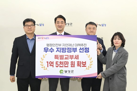 달성군은 지난해 12월 행정안전부 주관 ‘재난대응 안전한국훈련’에서 3년 연속 ‘우수 등급’을 획득한 데 이어, 자연재난 대책추진(호우) 분야 평가에서 ‘우수기관’으로 선정돼 특별교부세 1억 5천만 원을 확보했다. 또한 대구시가 주관한 자연재난 관리실태 평가에서도 ‘우수기관’으로 선정되며 재난 대응 분야 3관왕을 달성했다.