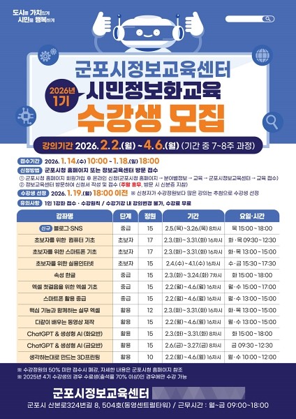 군포시는 시민들의 정보화 시대에 대한 적응 능력 향상 및 정보 소외 계층의 디지털 격차 해소를 위해 운영되는 ‘2026년 1기 시민정보화교육’의 수강생을 오는 14일부터 18일까지 모집한다고 밝혔다.