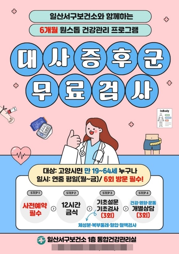 고양시 일산서구보건소가 대사증후군 검사와 맞춤형 건강상담을 한 번에 받을 수 있는 ‘건강원스톱서비스’를 연중 상설 운영한다. 만19세부터 64세까지 고양시민은 무료로 검사와 상담을 받을 수 있다.