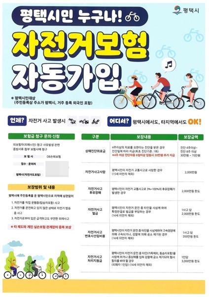 평택시가 시민의 안전한 자전거 이용을 위해 전 평택시민을 대상으로 하는 자전거 보험을 2026년에도 갱신 가입하고, 각종 자전거 사고에 대비한 보장을 지속 제공한다고 밝혔다.
