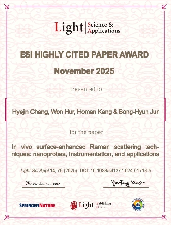 이번 수상 논문은 ‘In vivo surface-enhanced Raman scattering techniques: nanoprobes, instrumentation, and applications’를 주제로 ‘Light: Science & Applications’에 출판한 논문이다. 생체 내 표면증강 라만산란(SERS) 기술을 중심으로 나노프로브 설계, 광학 계측 시스템, 진단·치료 응용까지 전반을 체계적으로 정리해 높은 학술적 완성도를 인정받았다.