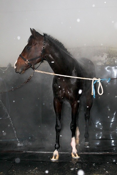 한겨울에도 경주마의 훈련은 계속된다. 한겨울에는 경주마 보호 차원에서 가급적 샤워를 자제하지만, 꼭 샤워를 해야 한다면 온수로 목욕시키고 말이 감기에 걸리지 않도록 원적외선 램프로 꼼꼼히 건조한다. 소리에 민감한 말이 아니면 헤어드라이어를 동원하기도 한다.