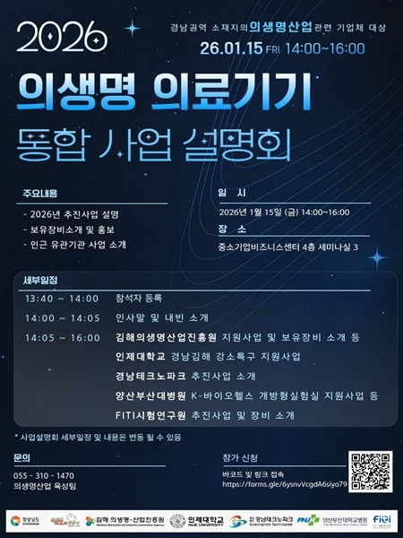 김해의생명산업진흥원이 오는 15일 지역 내 의료기기 및 헬스케어 기업의 실질적인 경쟁력 확보를 돕기 위한 '2026년 의생명·의료기기 통합 사업설명회'를 연다.