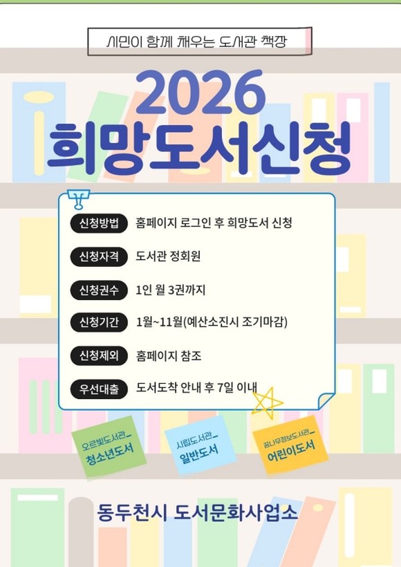 동두천시 도서문화사업소가 새해를 맞아 도서관 이용자가 원하는 책을 신청하면 구입해 비치하는 ‘희망도서 서비스’를 재개한다. 정회원은 1인당 월 최대 3권까지 신청할 수 있다.