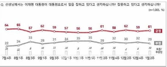 여론조사 전문기관 <엠브레인퍼블릭·케이스탯리서치·코리아리서치·한국리서치>가 지난 5일부터 7일까지 사흘 동안 전국에 있는 18세 이상 남녀 유권자 1005명을 대상으로 진행한 전국지표조사(NBS)에서 ‘이재명 대통령의 책무를 어떻게 평가하는가?’라는 질문에 ‘잘하고 있다’는 긍정적인 답변이 2주 전 조사에 비해 2%p 상승한 61%, 반면, ‘잘못하고 있다’는 부정적인 답변은 3%p 하락한 29%로 격차가 32%p로 벌어졌으며, ‘모름·무응답’은 7%로 집계됐다.