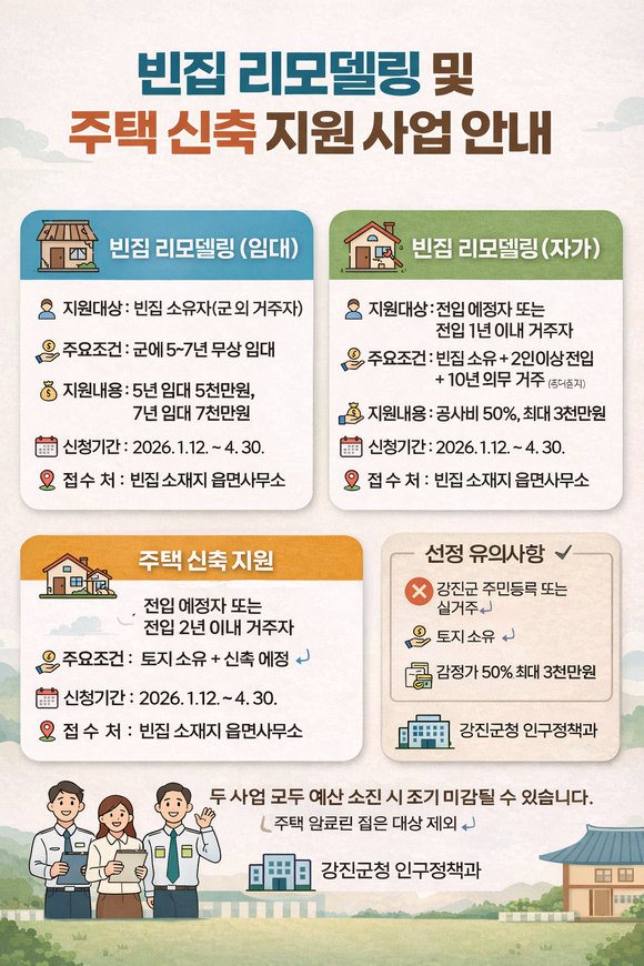 두 사업 모두 예산 소진 시 조기 마감될 수 있으며, 세부 요건 충족 여부에 따라 대상자 선정이 제한될 수 있다. 자세한 내용은 강진군청 인구정책과 주거지원팀 또는 각 읍·면사무소로 문의하면 된다.