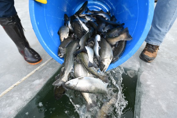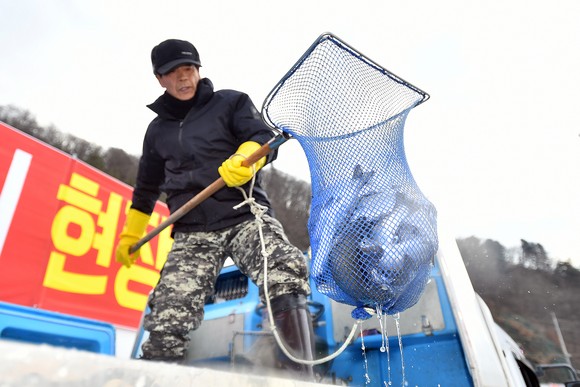 2026 얼음나라 화천산천어축제 개막을 하루 앞둔 9일, 오전부터 축제가 열리는 화천천에 축양장에서 수온 적응을 마친 산천어들이 방양되고 있다.