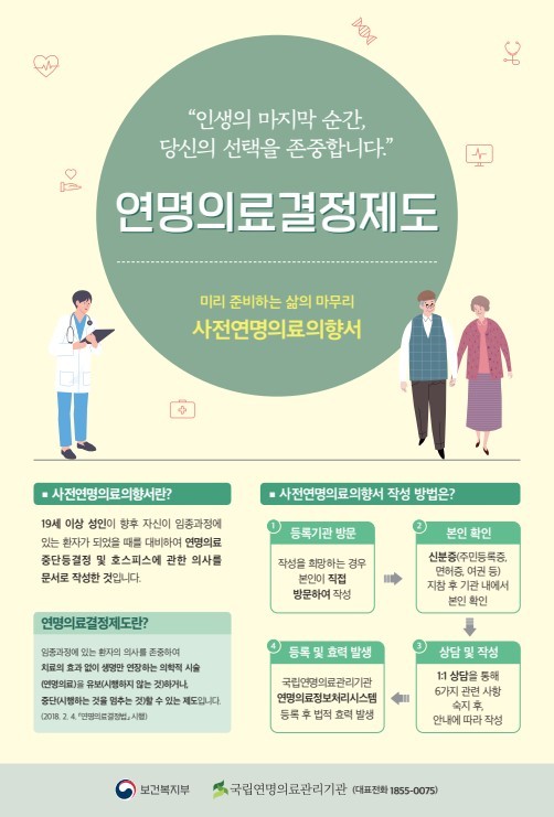 사전연명의료의향서는 임종 과정에 있는 환자가 연명의료 시행 여부와 호스피스 이용 등에 대해 본인의 의사를 사전에 문서로 남기는 제도로, 19세 이상 성인이면 누구나 신분증을 지참해 등록기관을 직접 방문해 작성할 수 있다.