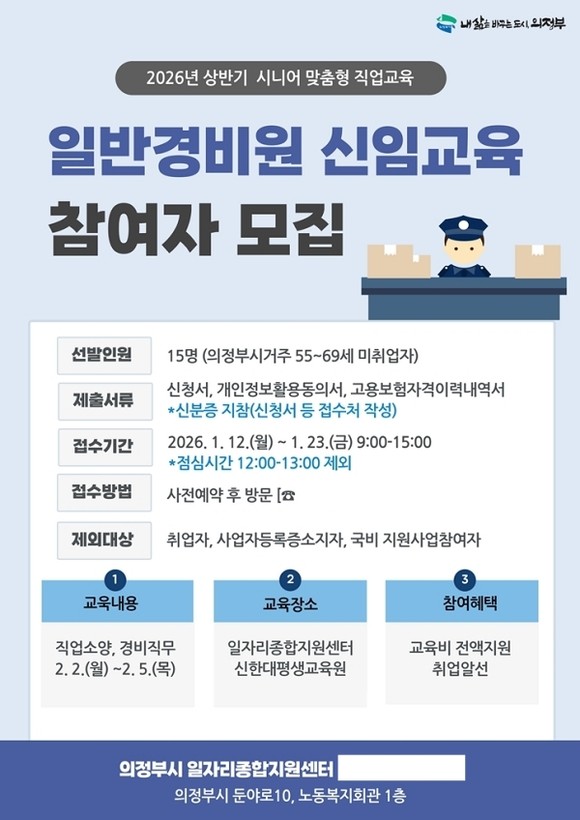 의정부시는 12일, 시니어 세대 재취업을 돕기 위해 2026년 상반기 일반경비원 신임교육 참여자 15명을 모집한다고 밝혔다.