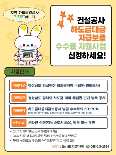 경남도는 건설 산업의 활력을 높이고 하도급 업체 보호하기 위해 '2026년 건설공사 하도급대금 지급보증 수수료 지원사업'을 확대 추진한다고 13일 밝혔다.