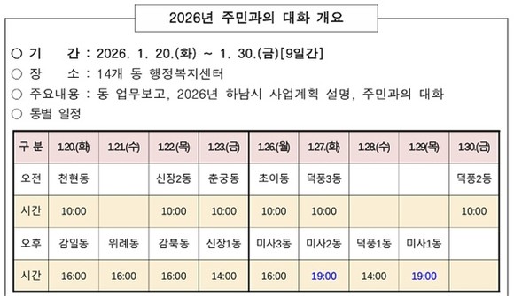 하남시는 오는 20일부터 30일까지 관내 각 동 행정복지센터를 순회하며 ‘2026년 주민과의 대화’를 개최한다고 밝혔다.