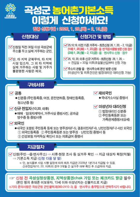 집중 신청 기간은 2026년 1월 20일부터 2월 13일까지이며, 신청 초기인 1월 20일부터 1월 23일까지는 읍․면 직원이 마을을 직접 찾아가는 현장 접수를 통해 고령자와 이동이 불편한 주민들의 편의를 높일 계획이다. 이후에는 주소지 관할 읍․면사무소에서 방문 접수를 이어간다.
