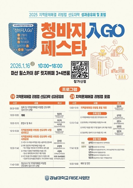 경남대학교 RISE사업단은 오는 16일 마산 힐스카이에서 지역문제해결 리빙랩 선도대학 성과공유회 및 포럼인 ‘청바지入GO페스타’를 개최한다고 14일 밝혔다.