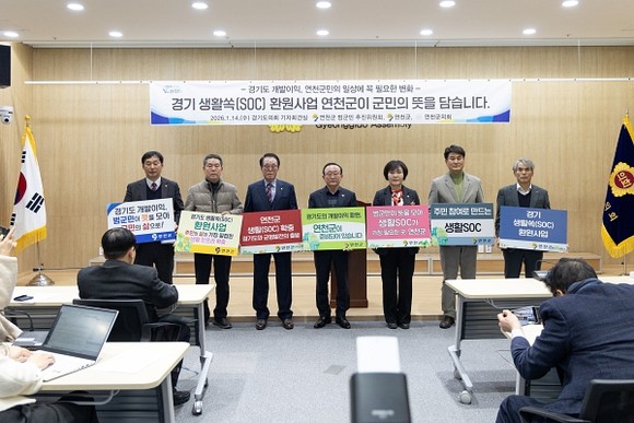 연천군과 연천군 범군민 추진위원회가 14일, 경기도의회 기자회견실에서 기자회견을 열고, 경기도 ‘경기 생활쏙(SOC) 환원사업’ 공모 대상지로 연천군이 선정돼야 한다며 지역 여건과 사업 필요성을 공식 제시했다.