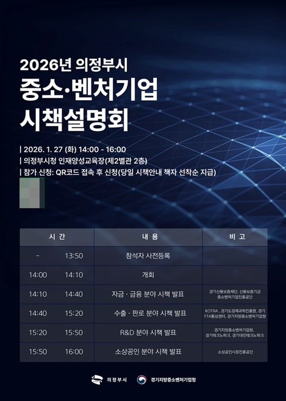 설명회 참가를 희망하는 의정부시 기업인은 오는 26일까지 시 홍보물에 게재된 QR코드를 통해 간편하게 신청할 수 있다. 참가비는 전액 무료이며, 신청 기업 중 선착순으로 다양한 기업 지원 정보를 집대성한 ‘2026 기업지원 시책 자료집’을 증정한다.
