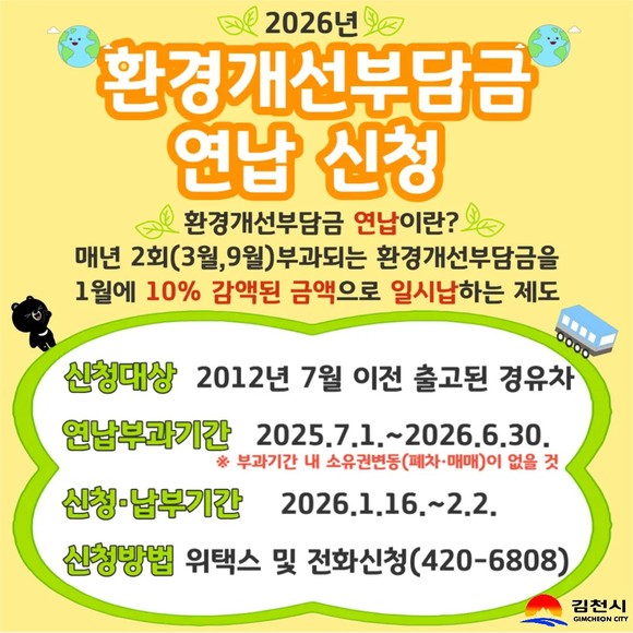 경북 김천시는 환경개선부담금 부과 대상 경유 자동차를 소유한 자를 대상으로 오는 16일부터 다음달 2일까지 환경개선부담금 일시 납부(연납) 신청을 받는다.