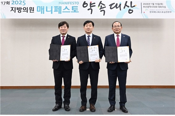 부산시의회 건설교통위원회 소속 의원들이 한국매니페스토실천본부가 주관한 ‘제17회 2025 지방의원 매니페스토 약속대상’에서 나란히 최우수상을 수상하며 지역 현안 해결과 정책 입법 역량을 전국적으로 인정받았다.