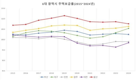 울산은 지난 2015년 이후 2024년까지 10년간 주택보급률이 100%를 넘었으며, 6대 광역시 중 가장 높은 수치를 기록했다.